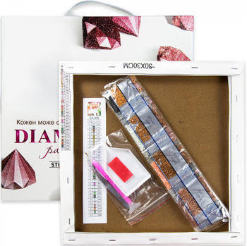 клей; лоток для страз; пинцет; подрамник; полотно; стилус; стразы;