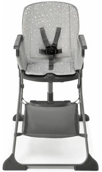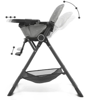 Scaunul spatios al scaunului inalt este realizat din materiale usor de curatat. Puteți îndepărta cu ușurință chiar și cele mai încăpățânate pete de pe el. Scaunul are curele reglabile in 5 puncte. Sub scaun puteți găsi un coș pentru lucruri mici, precum șervețele umede sau o bavetă suplimentară.
