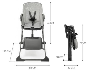 Acest FOLDEE este un scaun înalt pliabil perfect pentru părinții mobili și apartamentele mici. Elegant, mobil și ușor de curățat, acest scaun înalt se pliază într-o singură mișcare. Vrei să mergi undeva? Sau poate copilului tău tinde să se răzgândească și uneori îi place să mănânce în bucătărie și alteori în sufragerie? Cu FOLDEE, aceasta nu este o problemă! Acest scaun înalt a fost proiectat pentru mese confortabile. Are 3 pozitii de spatar si 2 pozitii de suport pentru picioare; Datorită acestui fapt, bebelușul va putea să mențină postura corectă și să se simtă confortabil în timp ce mănâncă. Puteți regla tava în 3 poziții față de șezut și, dacă este necesar, spălați-o sub jet de apă. Scaunul inalt are un ham in 5 puncte, astfel incat bebelusul este intotdeauna in siguranta.