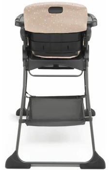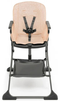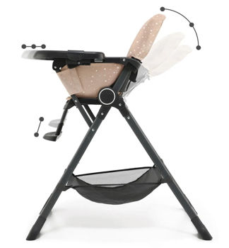 Scaunul spatios al scaunului inalt este realizat din materiale usor de curatat. Puteți îndepărta cu ușurință chiar și cele mai încăpățânate pete de pe el. Scaunul are curele reglabile in 5 puncte. Sub scaun puteți găsi un coș pentru lucruri mici, precum șervețele umede sau o bavetă suplimentară.