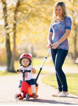 Cand copilul este mic, el va sta confortabil pe scaunelul ergonomic si va inainta impingand cu piciorusele. Cele 3 roti ale trotinetei ofera copilului stabilitatea de care are nevoie pentru a explora fara frica lumea din jur. Mecanismul de luare a curbei prin inclinarea ghidonului este inteles intuitiv, usor si rapid de catre copil. Sub scaunel se afla un sertar detasabil in care pot fi depozitate jucariile preferate sau produse alimentare. Sertarul poate fi scos si introdus la loc foarte usor, chiar si de catre copil. Astfel acesta sta linistit ca jucariile sale sunt accesibile oricand vrea si ca sunt in siguranta.