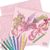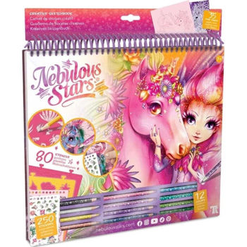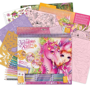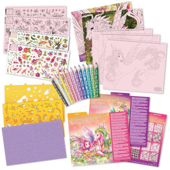 35 de pagini de schiță roz, 80 de șabloane, 4 modele de frecare, 250 de autocolante, 12 creioane colorate, 12 tehnici de desen, povestea unicornilor Lilyaz și Viviaz, instrucțiuni