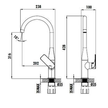 înălțimea bateriei 428 mm; unghiul de rotire al duzei: 360°