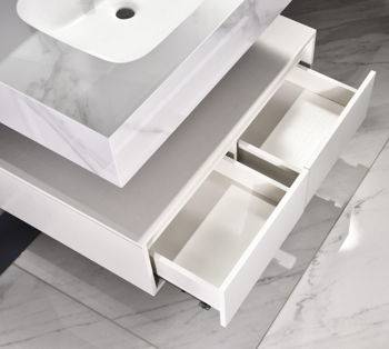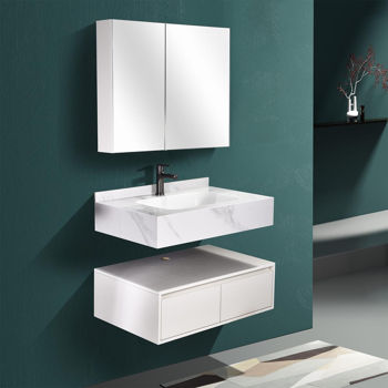 în set: oglindă cu LED și dulap (125x800x650 mm), raft cu sertare din piatră sinterizată (250x800x500 mm); chiuvetă din piatră sinterizată (150x800x500 mm)