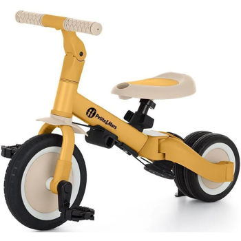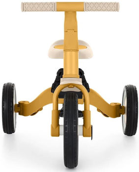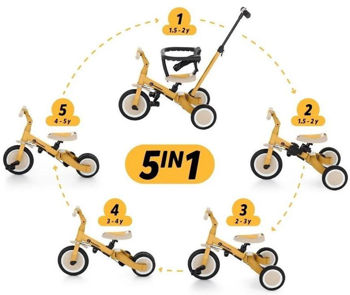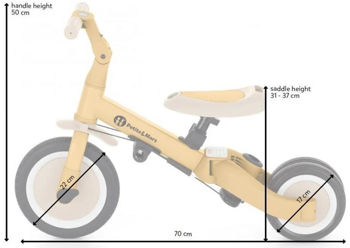 Bicicletă multifuncțională cu trei roți, destinată copiilor cu vârsta între 1,5 și 5 ani sau cu greutatea de până la 25 kg. Aceasta nu este doar un mijloc de transport și un instrument de învățare a echilibrului, ci și un companion al copilului în diferite etape ale dezvoltării sale. Transformarea bine gândită a bicicletei se adaptează nevoilor copilului pe măsură ce își dezvoltă abilitățile motorii. Inițial, aceasta este o bicicletă cu trei roți cu posibilitatea de ajutor din partea părinților, iar versiunea finală este o bicicletă standard cu pedale, fără elemente de suport suplimentare. Datorită acestor modificări, puteți ajuta copilul să învețe să meargă pe două roți.