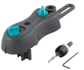 Set de găurire pentru terasă WolfCraft (6960000) - acest sistem vă garantează dispunerea curată şi uniformă a șuruburilor pe terasa dumneavoastră din lemn. Piesa centrală a setului este șablonul mobil de găurire pentru terase, cu ajutorul căruia aliniați perfect găurile, fără efort. Pentru aceasta aliniați șablonul la ultima îmbinare cu șurub și pentru pregătirea îmbinării găuriți mai întâi cu burghiul pentru pregăurire și zencuitorul bucșa de perforare din față, apoi cea din spate. Bucșele sunt confecționate din oţel întărit pentru o ghidare sigură a burghiului. Șablonul mobil de găurire poate fi reglat la grosimea plăcii de 100-145 mm.