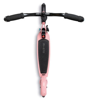 Micro Speed Deluxe are roti cu un diametru de 180mm, care asigura o plimbare confortabila. Roata din fata are aparatoare impotriva stropirii, iar in spate frana are acelasi rol. Ghidonul este in stil retro, pentru un mai bun echilibru al utilizatorului. Va tineti mult mai usor echilibrul pe trotineta atunci cand tineti mainile departate. De asemenea, virajele sunt mai facile si fara pierderea stabilitatii. Ghidonul este reglabil intre 780 si 1030mm.