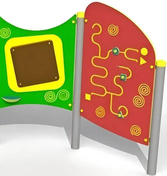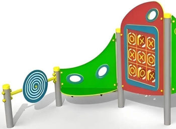 format dintr-o bancă, un tic-tac-toe, o tablă cu cretă și un panou Labirint