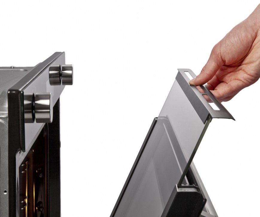 Чтобы дверцу можно было отмыть как можно лучше и со всех сторон, она снимается. Как правило, это делается очень просто, а при установке обратно главное – попасть в пазы. И все же до мойки целой дверцы дело может и не дойти, а вот отмыть внутреннее стекло бывает нужно довольно часто. Так вот, практически во всех современных плитах и духовках внутреннее стекло вынимается «легким движением руки». А дальше – его можно замочить, помыть специальным составом там, где это удобно или доверить посудомоечной машине – оно закаленное, это ему не противопоказано.