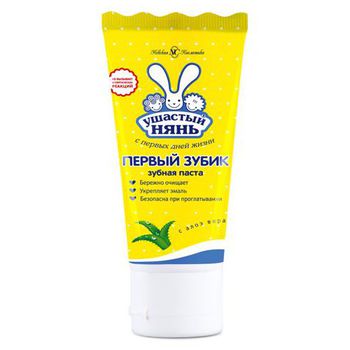 Зубная паста Ушастый Нянь Первый зубик бережно очищает, не травмирует десны и способствует формированию крепкой эмали. Не содержит красители, ароматизаторы, фтор и сахар.