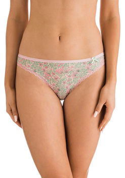 Трусики бикини, низкая линия талии. Узкие боковинки (4 см). Полностью закрывают ягодицы, мелкий принт, по линии бедер кружевная отделка