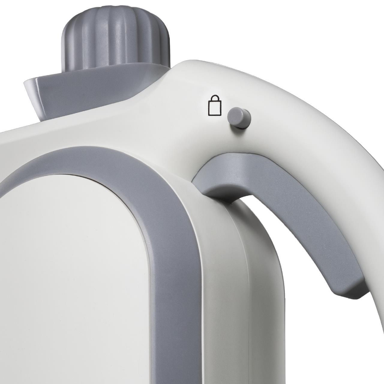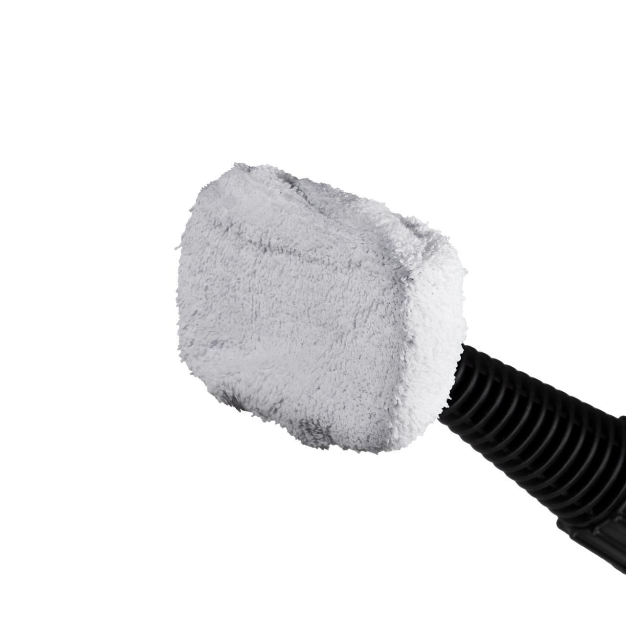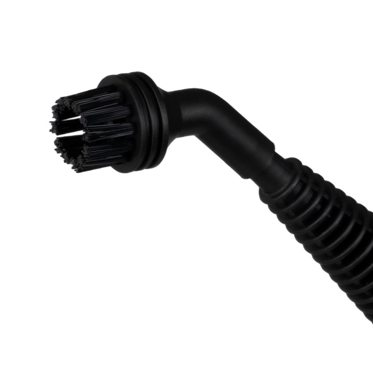 точечное сопло, малая круглая щетка-насадка с полимерной щетиной, насадка для одежды, гибкий шланг для подачи пара, насадка для мытья окон/дверей, обтяжка из махровой ткани, мерный стакан, воронка, угловая насадка