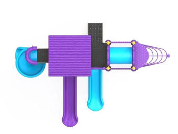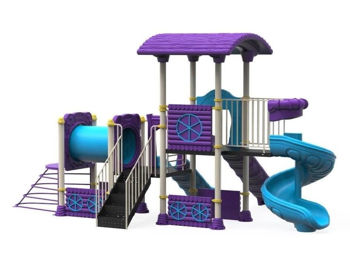 Комплектация: Лестница с поручнями, Башня с крышей, две Башни без крыши, две Горки прямые (Н=1,5м; Н=1м), Горка винтовая (Н=1,5м), Тубус, Балкон, элемент для лазанья, комплекс украшен тематическими элементами.