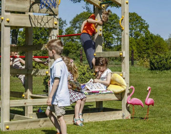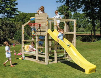 Базовая комплектация: Игровая башня (высота платформ от земли 120 cм и 40 cм), Лестница, Горка (H=1,2м), Скалодром, Рукоход, Гладиаторская сетка, Баскетбольное кольцо, два Турника.