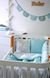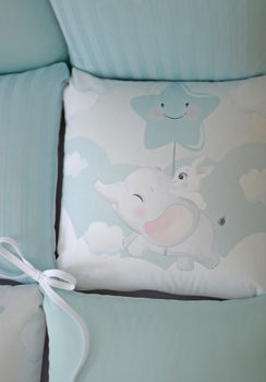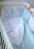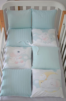 Защита (бампер): 8 частей (32х32 см) на 3 стороны кроватки; Бережная стирка изделия наизнанку; Температура не выше 30°C; Гладить при средней температуре до 150°C.