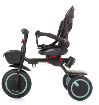 Два положения сиденья – лицом вперед и лицом к лицу. Может управляться ребенком или толкаться взрослым за ручку. Когда трехколесный велосипед катит взрослый, ребенок ставит ноги на подставку для ног, а педали передних колес отключаются.