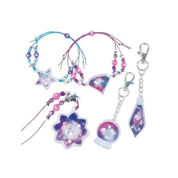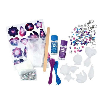 8 драгоценных камней, 2 бутылочки со смолой, наклейки, блёстки и глиттер, нейлоновые шнурки, 105 бусин, 2 крючка и 2 соединительных кольца, ёмкость для смешивания и палочка