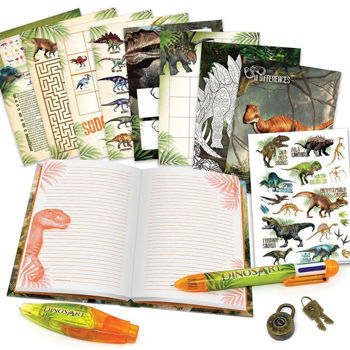 6-цветная шариковая ручка; ручка-аппликатор для рисования; множество информации о динозаврах; 44 страницы увлекательных занятий; страница с наклейками; 150 линованных страниц дневника