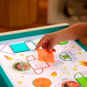 Световой короб Look & Shine™ от B. Toys идеально подходит для любопытных и творческих юных умов! Этот интерактивный световой стол меняет цвет одним нажатием кнопки, предлагая пять различных цветов освещения для развития воображения и обучения. Во время игры дети могут изучать формы и цифры, а также по-новому открывать для себя цвета.