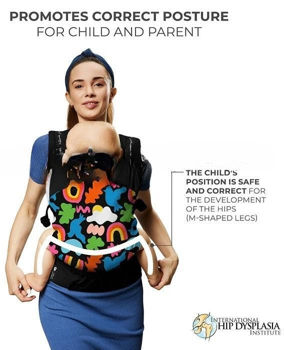 - Регулируемые ремни обеспечивают правильное положение спины ребенка и родителя.