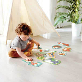 Этот набор из 10 очаровательных пазлов познакомит малышей с животными леса: пчёлка, косуля, лиса, дятел, лягушка, медведь, сова, белка, волк и ёж.