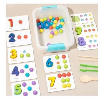 10 карточек с цифрами, блоки с цифрами от 1 до 10, 55 разноцветных деревянных бусинок, пара палочек, зажим, ложка и коробка для хранения