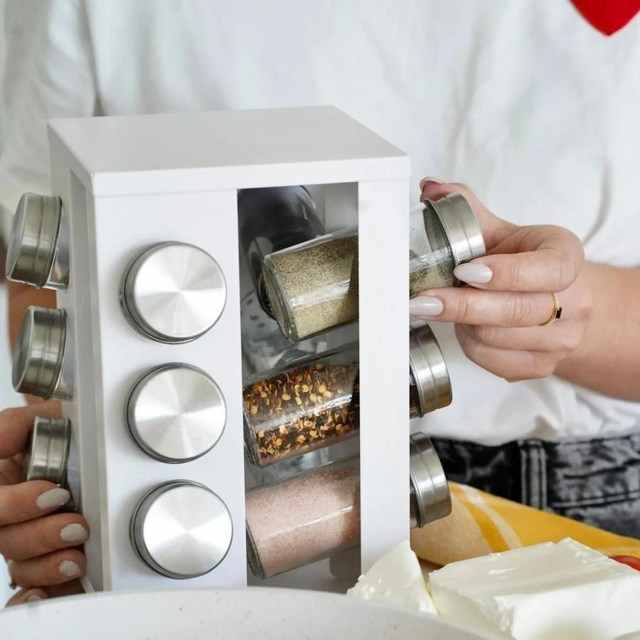 12 стеклянных ёмкостей для специй, подставка