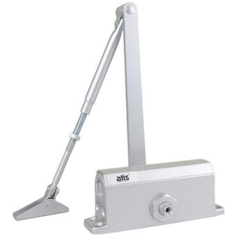 ATIS DC-5036-BC доводчик верхнего монтажа с рычажной передачей. Коммерческое использование, наработка на отказ 1000000 циклов. Усилие закрывания от DIN3 до DIN6 (вес двери от 60 до 120 кг, ширина от 950 до 1400 мм). Функция Back-check.