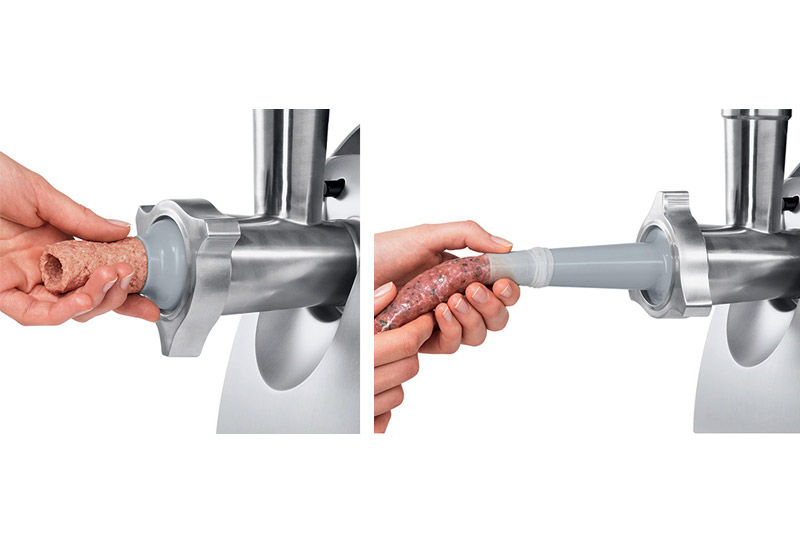 Это тоже трубка, на которую надевается натуральная (или ненатуральная, кому как нравится) оболочка. Мясо перемалывается, потом фарш продвигается по трубке и выдавливается в оболочку, которую надо придерживать и вообще контролировать процесс.